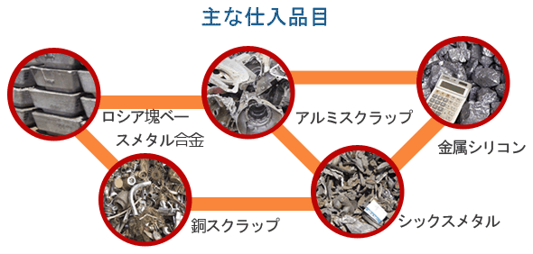 金属スクラップの購買経験は豊富で、業界内では厚い信用と優れた評価を得ております。世界各地から年間300万トンを越える様々なスクラップを購入し、自社の熔解・製錬工場への供給とともに、他社とのスクラップ売買も行っております。 下記は当社の主要仕入品目でありますが、世界のどこからでも皆様のお役に立てれば喜んで買い受けさせて頂きます。 どうぞ気軽に当社へご連絡下さい。